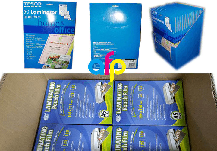 Najpopularniejsza jest błyszcząca folia laminowana z poliestrowych torebek PET o wymiarach 125 mikronów (grębokości) i rozmiarze A4 (216 mm * 303 mm), która jest szeroko stosowana do ochrony dokumentów i zdjęć.